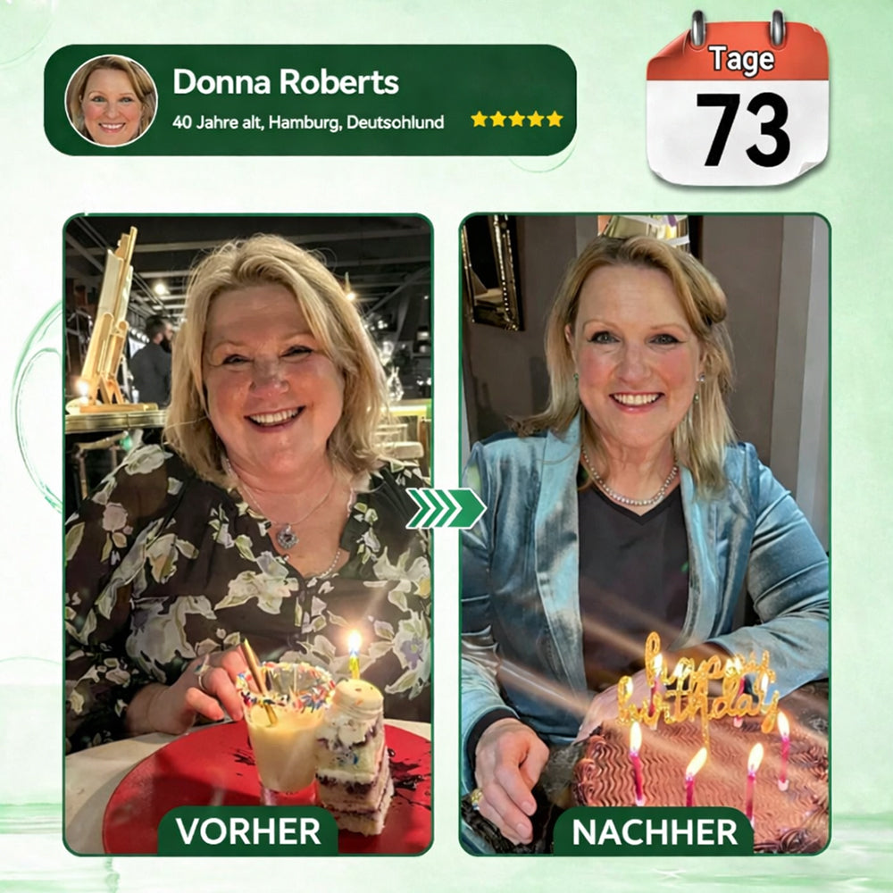 Seit August habe ich 58,9 kg abgenommen. Meine Fettleber hat sich von schwergradig zu mild verändert, Bluthochdruck und Cholesterin sind fast normal. Meine Energie ist zurück, und ich fühle mich wieder wie ich selbst. Dieses Produkt ist ein vollständiger Game-Changer.“