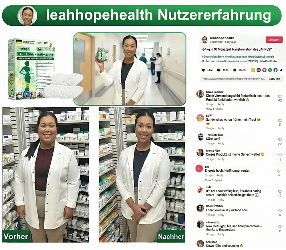 „Nach Jahren in der Krankenhausapotheke verstand ich die Grenzen traditioneller Gewichtsmanagement-Produkte besser als die meisten – langsame Ergebnisse, schnelles Wiederzunehmen nach dem Absetzen und kaum Unterstützung für das allgemeine Stoffwechselgleichgewicht. Trotz sorgfältiger Ernährungsanpassung und mehr Bewegung stieg mein Gewicht stetig an. Bis ich mit demLBMLBM® Moringa · Berberin × NAD+ 10-in-1 Advanced Nano-Mikronadel-Patchanfing, half mir nichts wirklich.