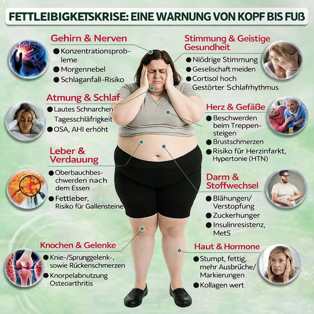 Viele glauben, Übergewicht sei nur eine Frage des Aussehens – doch im Inneren gefährdet es deinen Körper still und leise. Bauchfett drückt auf Herz und Lunge, sodass jeder Atemzug und jeder Schritt schwerer anfühlt. Es verstopft die Arterien und erhöht das Risiko von Herzinfarkt oder Schlaganfall. Jahr für Jahr beschleunigt diese Belastung den Alterungsprozess, schwächt die Organe und raubt dir die Energie, um das Leben in vollen Zügen zu genießen.