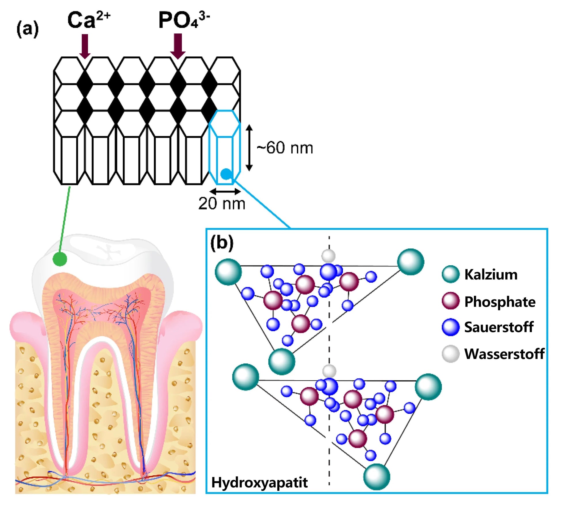 Der Zahnschmelz ist das härteste Gewebe im menschlichen Körper. Er besteht zu rund 96 % aus Mineralien, hauptsächlich aus Hydroxylapatit – einem kristallinen Calciumphosphat, das für Stärke und Widerstandsfähigkeit sorgt.